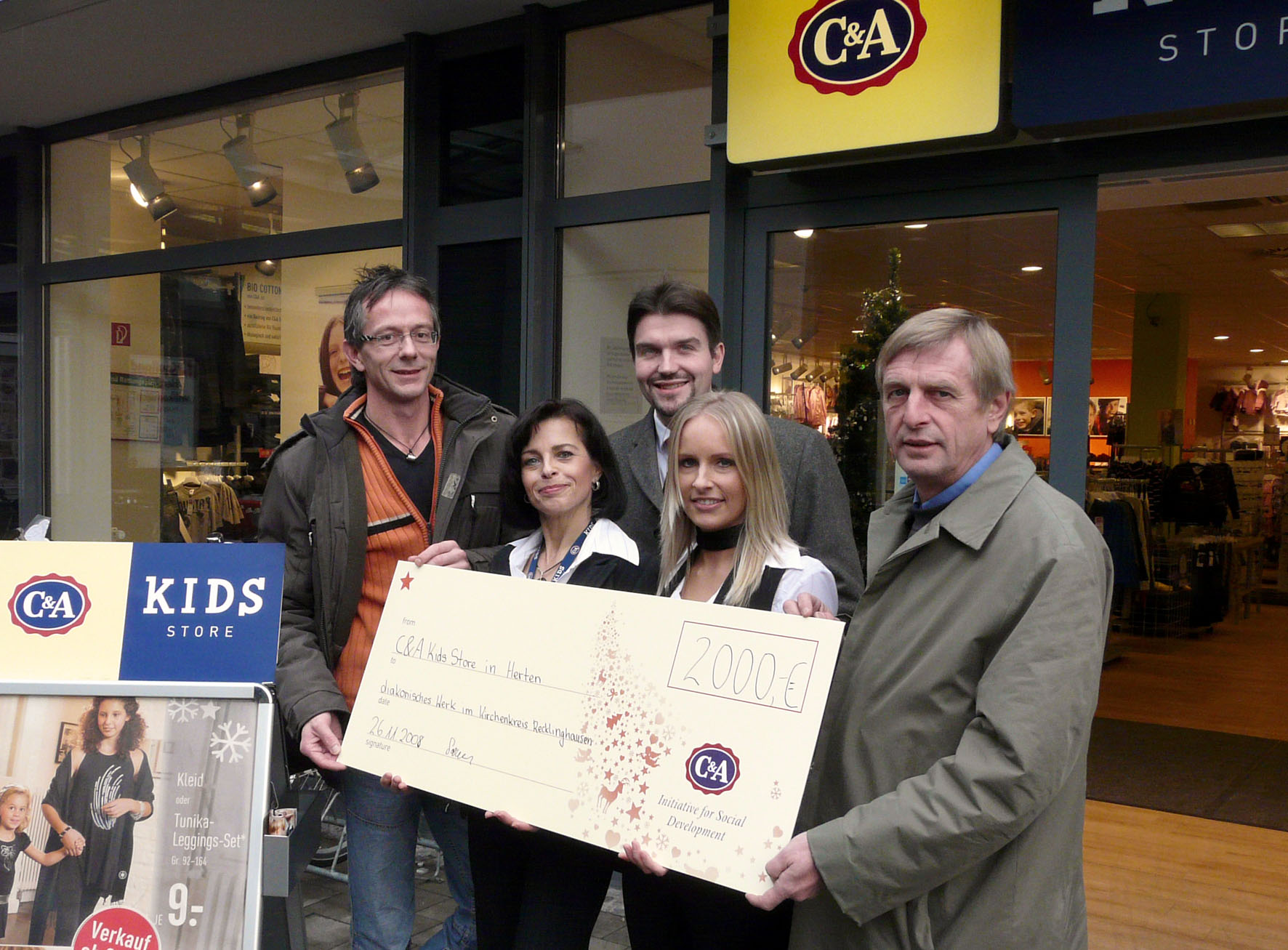 Martin Dienberg, Annette Oldenbürger, Bürgermeister Dr. Uli Paetzel, Monika Sonsna (Filialleiterin) und Manfred Liedmann bei der Scheckübergabe vor dem C&A Kids-Store in Herten (v.l.).