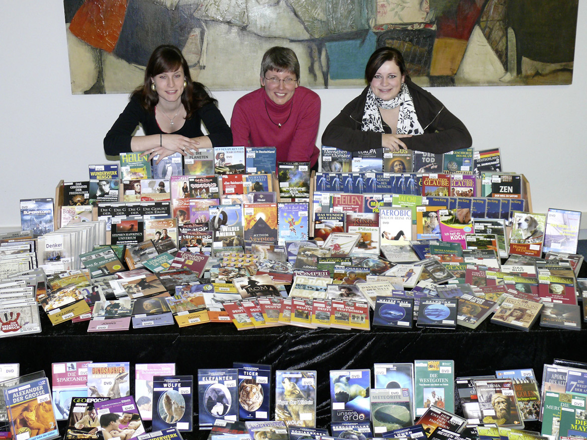 Gemeinsam mit den Auszubildenden Marina Deerberg (l.) und Stephanie Merschhoff (r.) präsentiert die stellvertretende Büchereileiterin Gudrun Völcker das umfangreiche neue Sach-DVD-Angebot der Iserlohner Stadtbücherei.