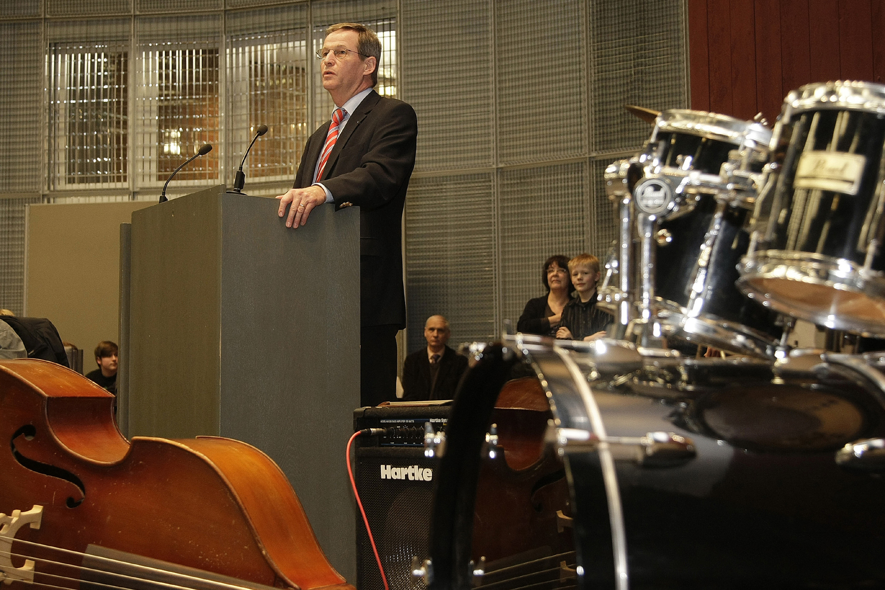 Landrat Peter Ottmann, Schirmherr des 46. Regionalwettbewerbs "Jugend musiziert", freute sich mit den Nachwuchsmusikern über die hervorragenden Ergebnisse in allen Kategorien. Foto: Alois Müller/Kreis Viersen - Abdruck honorarfrei