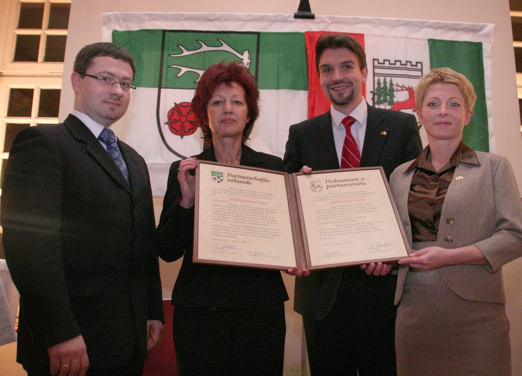 v.l.: Piotr Piotrowski (Stv. Generalkonsul der Republik Polen), Danuta Górska (Bürgermeisterin Stadt Szczytno), Bürgermeister Dr. Uli Paetzel und Beata Boczar (Vorsitzende des Szczytnoer Stadtrates).