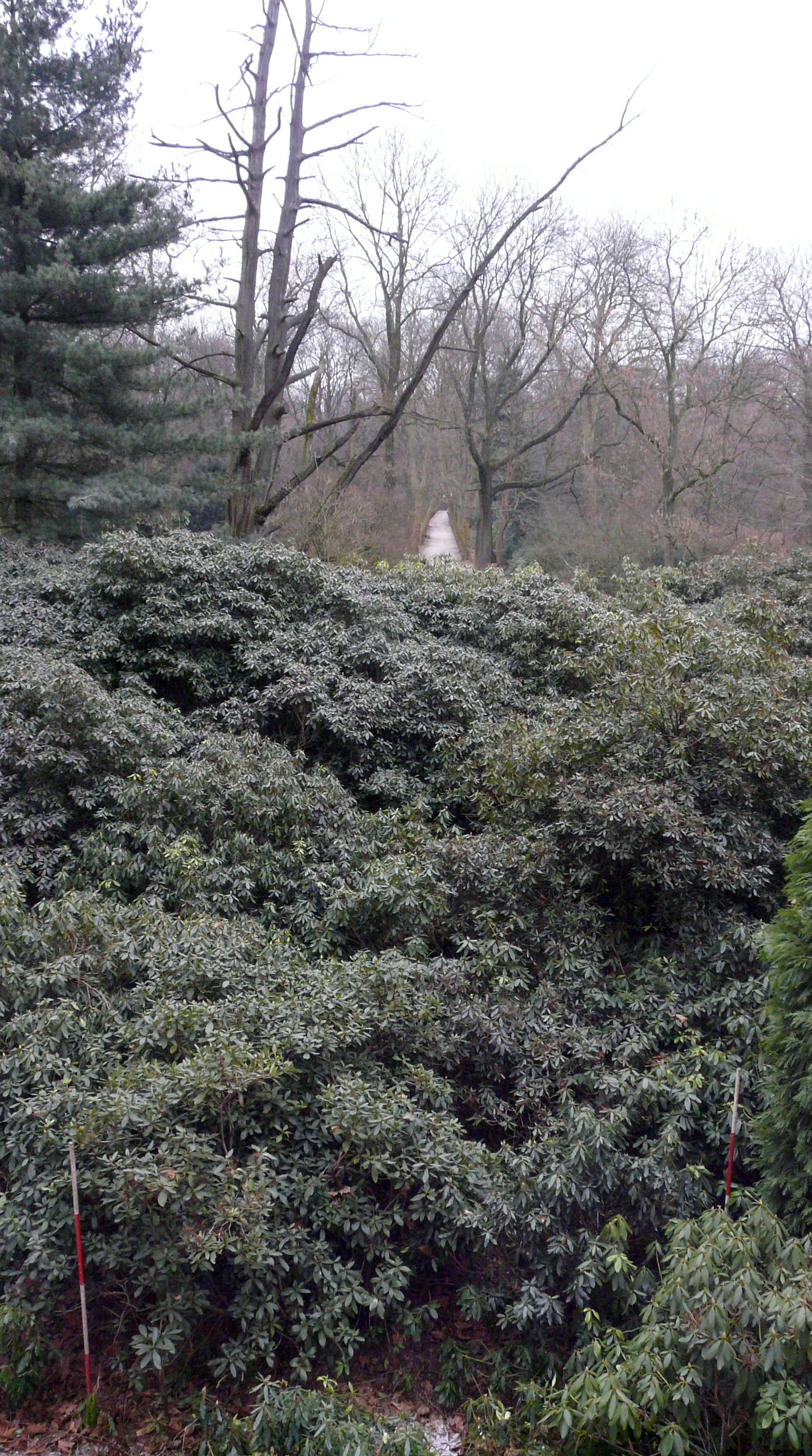 Der Blick aufs Tabakhaus wird in Höhe der Narzissenwiese noch durch einen großen Rhododendron verhindert, doch die Markierungen im Vordergrund zeigen, wo bald schon die Sichtachse verlaufen wird.