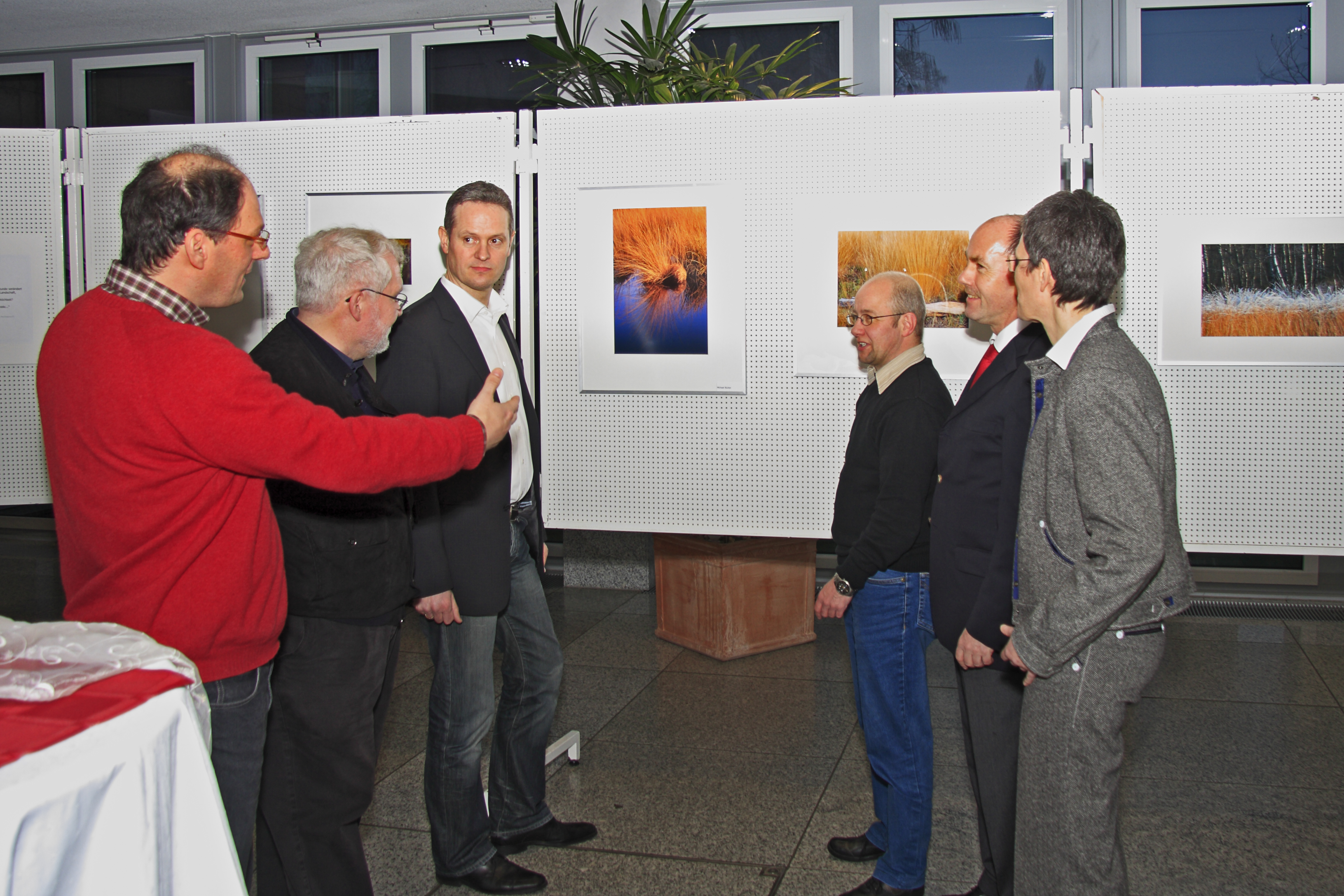 Die Mitglieder der "Blende 22" - Anneli Hegerfeld-Reckert, Leon Uppena, Dirk Grasse, Dieter Blase und Michael Bücker (v.r.) zeigen Landrat Thomas Kubendorff (2.v.r.) die Bilder der Ausstellung.