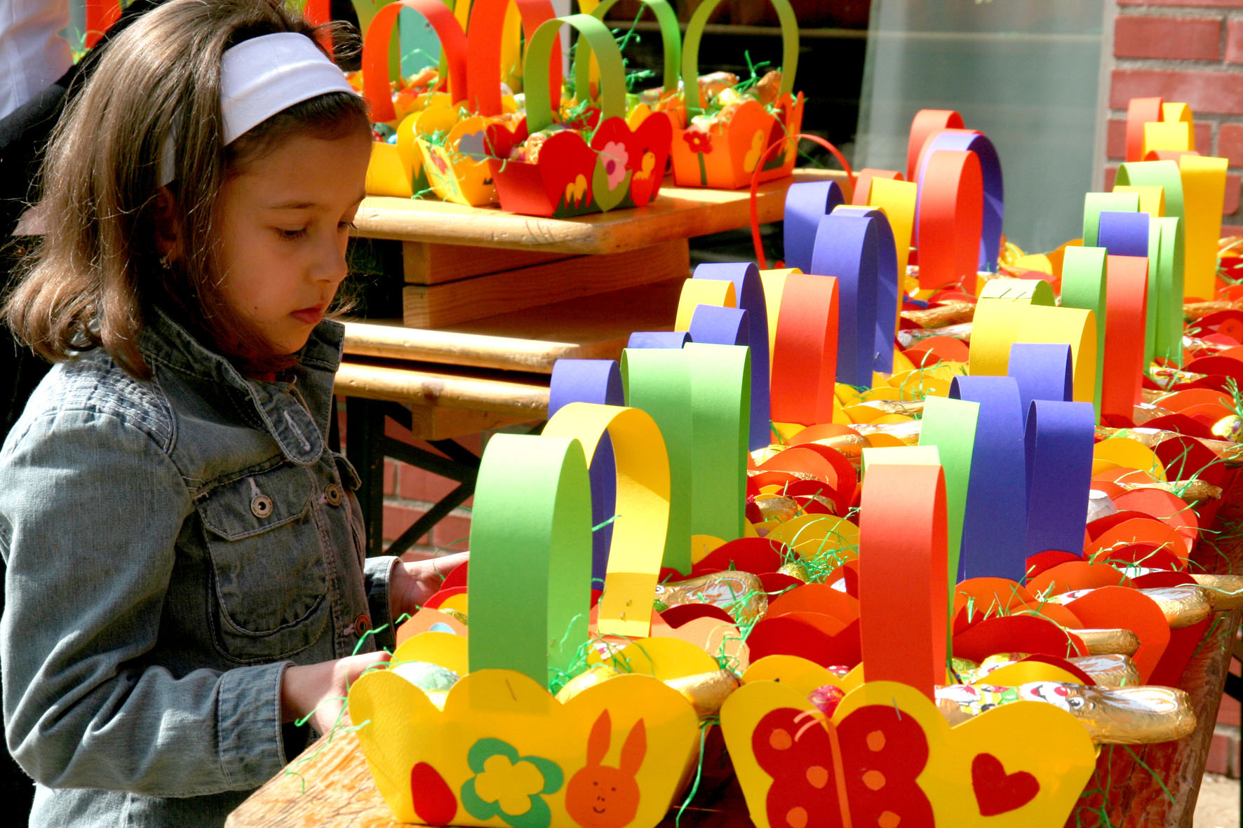 Dieses kleine KiKo-Mädchen kann sich gar nicht entscheiden: Welcher der schönen Osterkörbchen soll es denn sein?