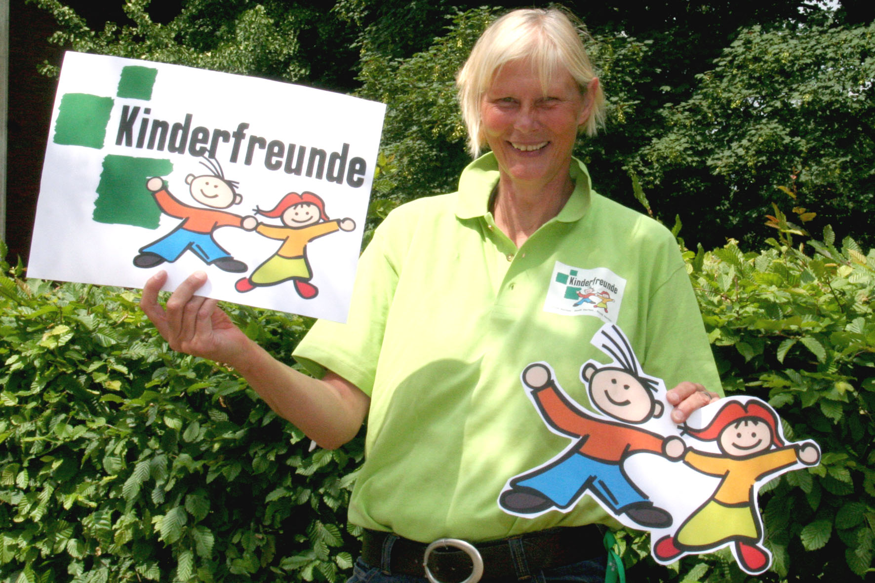 Kinderfreundin Beate Kleibrink stellt Jan und Jule vor: Die beiden gezeichneten Figuren begleiten Hertener Kinder ab sofort durch alle Projekte mit den Kinderfreunden.