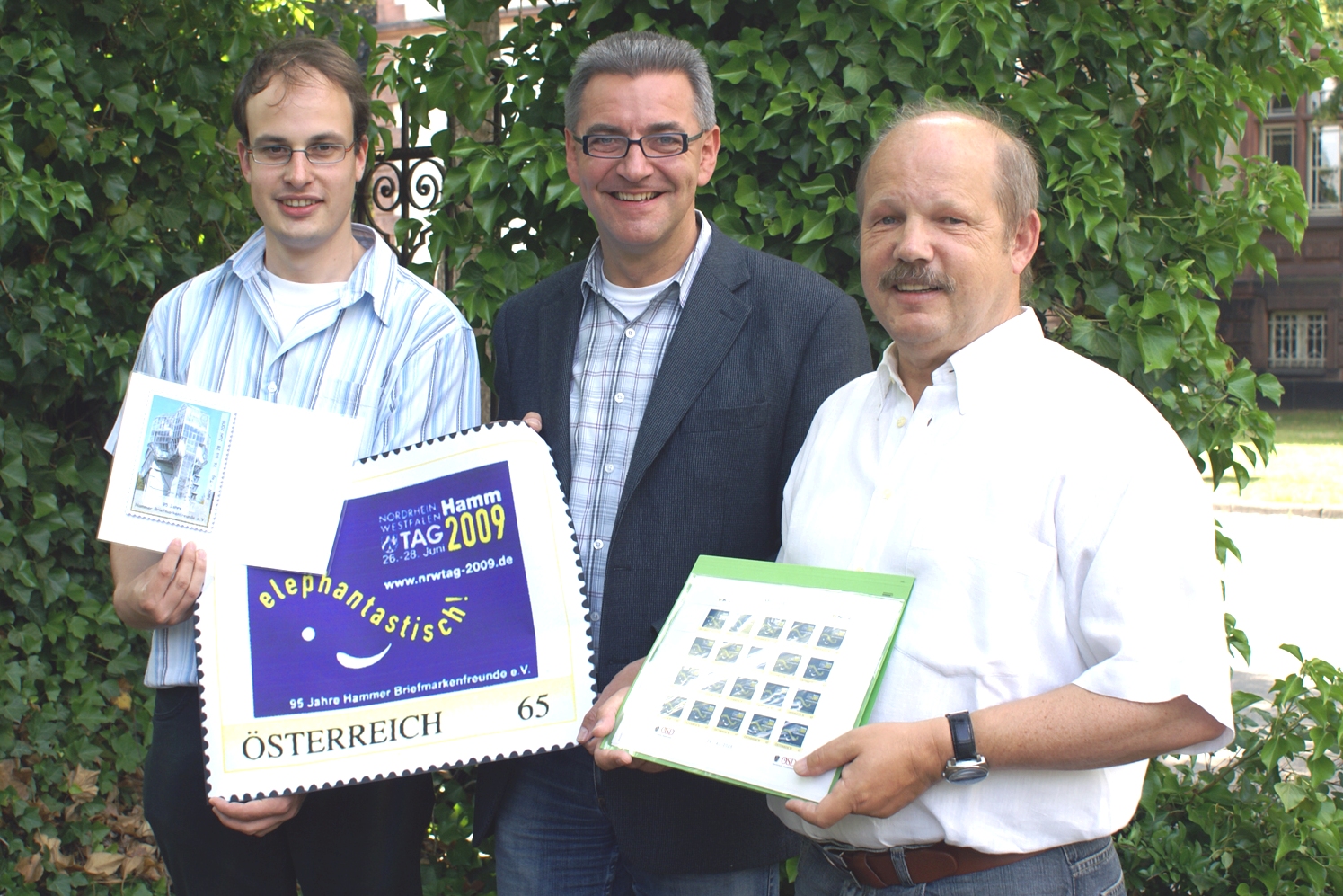 Eigene Briefmarke zum Nordrhein-Westfalen-Tag: Stephan Kerl, stv. Jugendgruppenleiter, Hammer Briefmarkenverein, Klaus Ernst, Stadtmarketing, Heinrich Sonderhüsken, 1. Vorsitzender Hammer Briefmarkenverein (v.lks.n.re.)