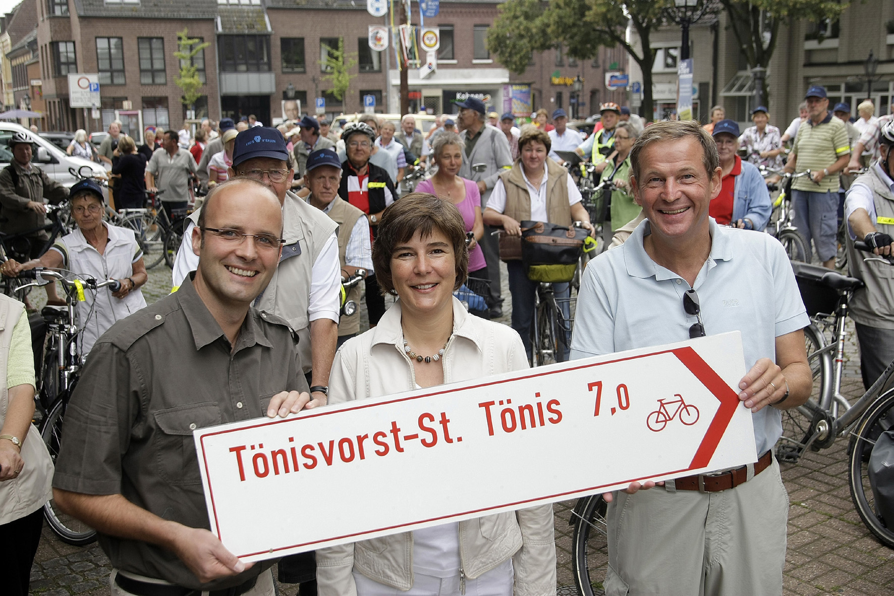 1.600 einheitliche Wegweiser kennzeichnen jetzt die Radwege im Kreis Viersen: Landrat Peter Ottmann (rechts) stellte gemeinsam mit Angelika Hamacher, stellvertretende Bürgermeisterin von Tönisvorst, und Thomas Goßen, Bürgermeisterkandidat in Tönisvorst, die neuen Hinweisschilder vor. Foto: Alois Müller/Kreis Viersen - Abdruck honorarfrei