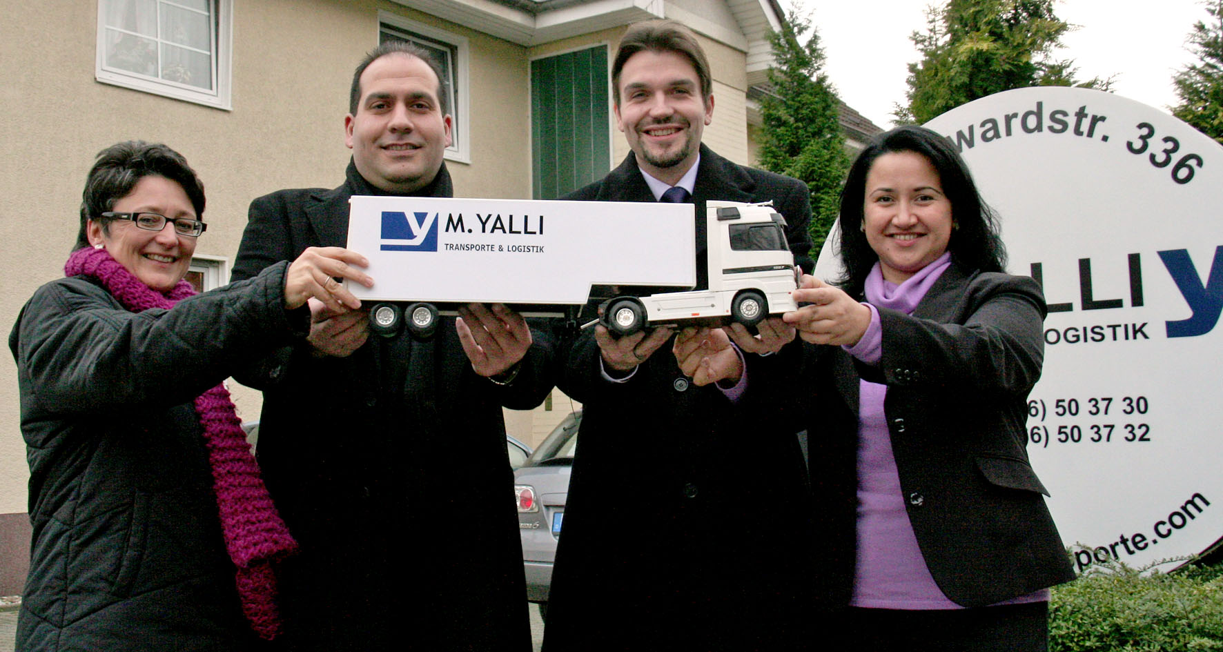 Frauke Wiering (Wifö Stadt Herten), Muhammet Yalli, Bürgermeister Dr. Uli Paetzel und Iclal Yalli vor der Spedition in Herten-Süd.