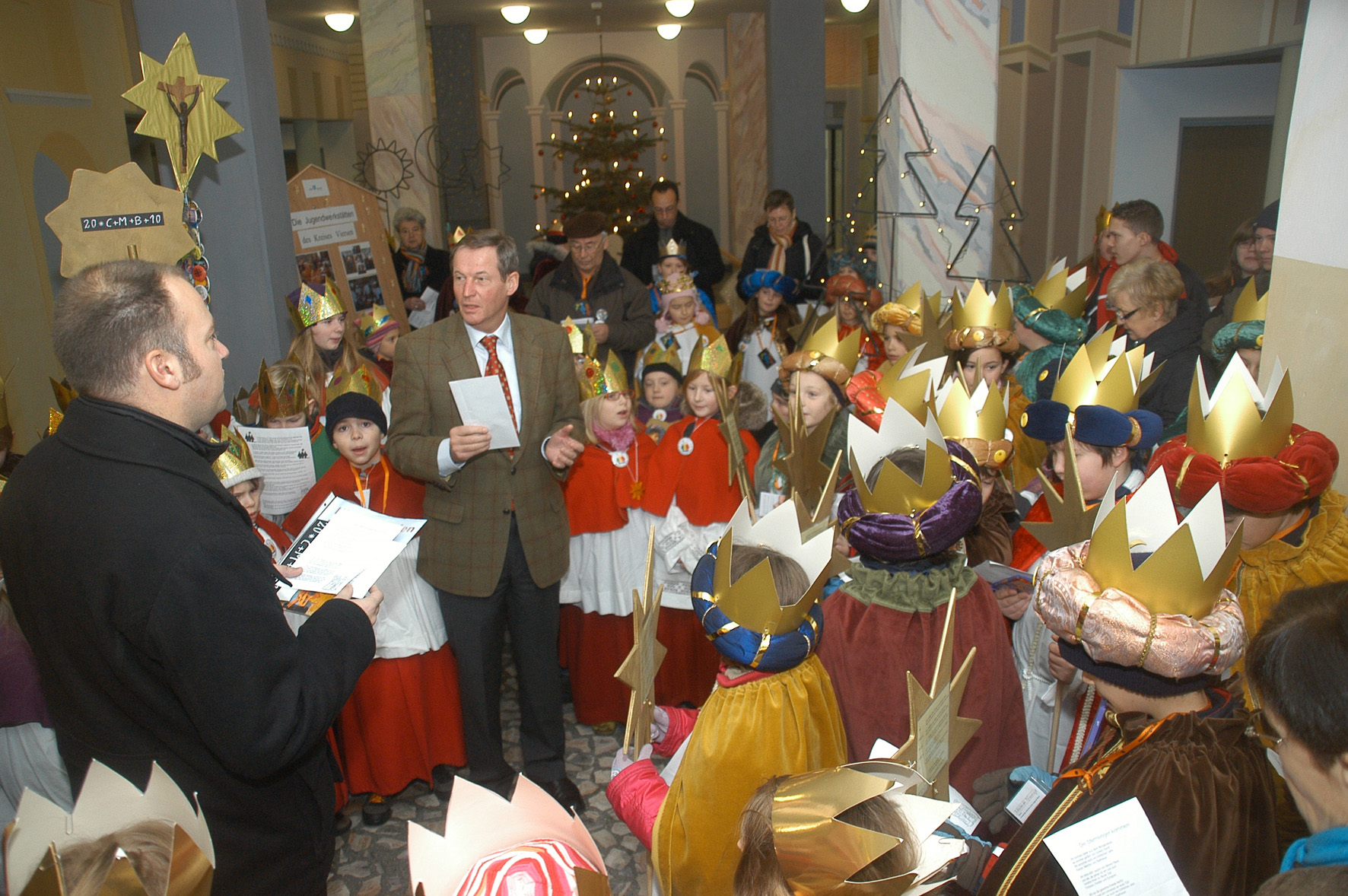 Landrat Peter Ottmann begrüßte rund 50 Sternsinger aus drei Pfarren, die gemeinsam mit Manfred Zellkes (links) ins Kreishaus gekommen waren. Foto: Horst Siemes/Kreis Viersen - Abdruck honorarfrei