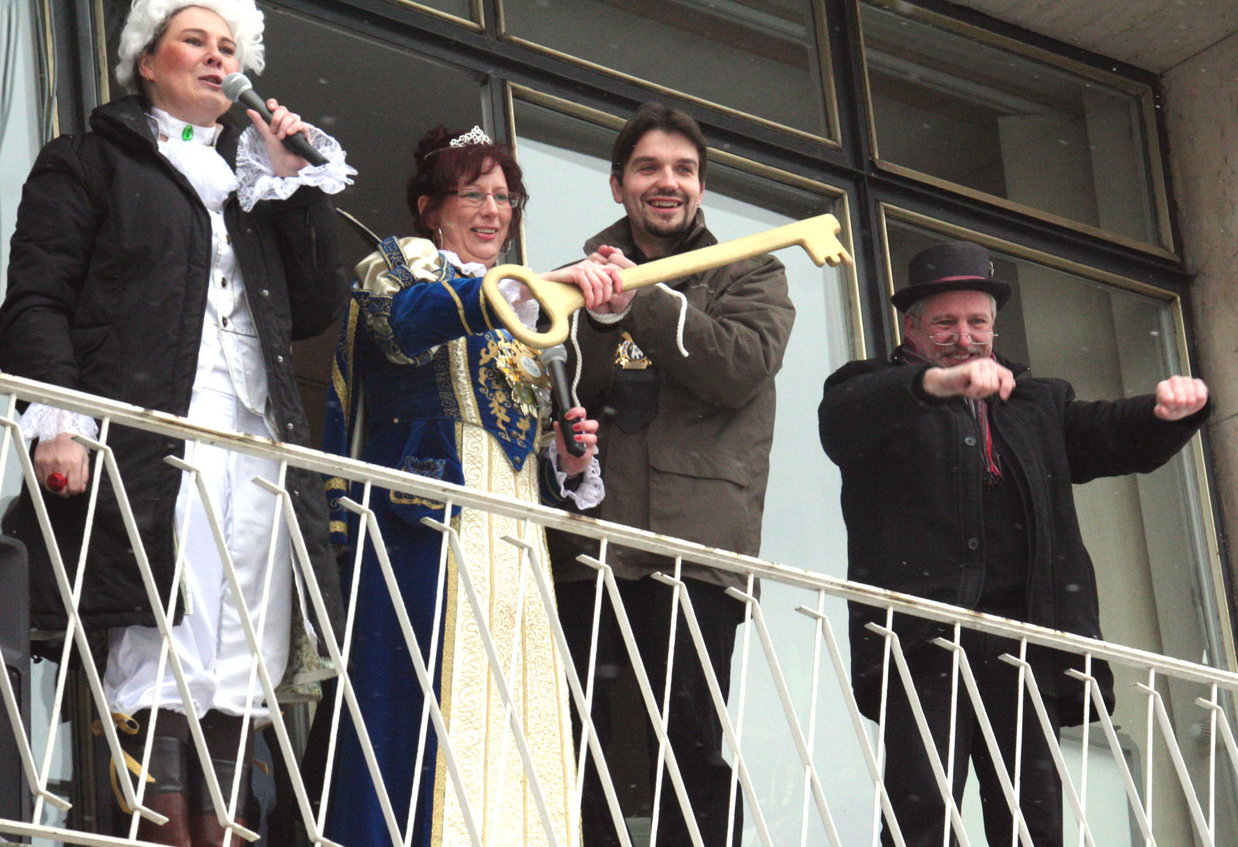 (v. li. n. re.:) Conny Meyer, Karnevalsprinzessin Heike II, Bürgermeister Dr. Uli Paetzel und Adrian Gülden feiern mit den Jecken.