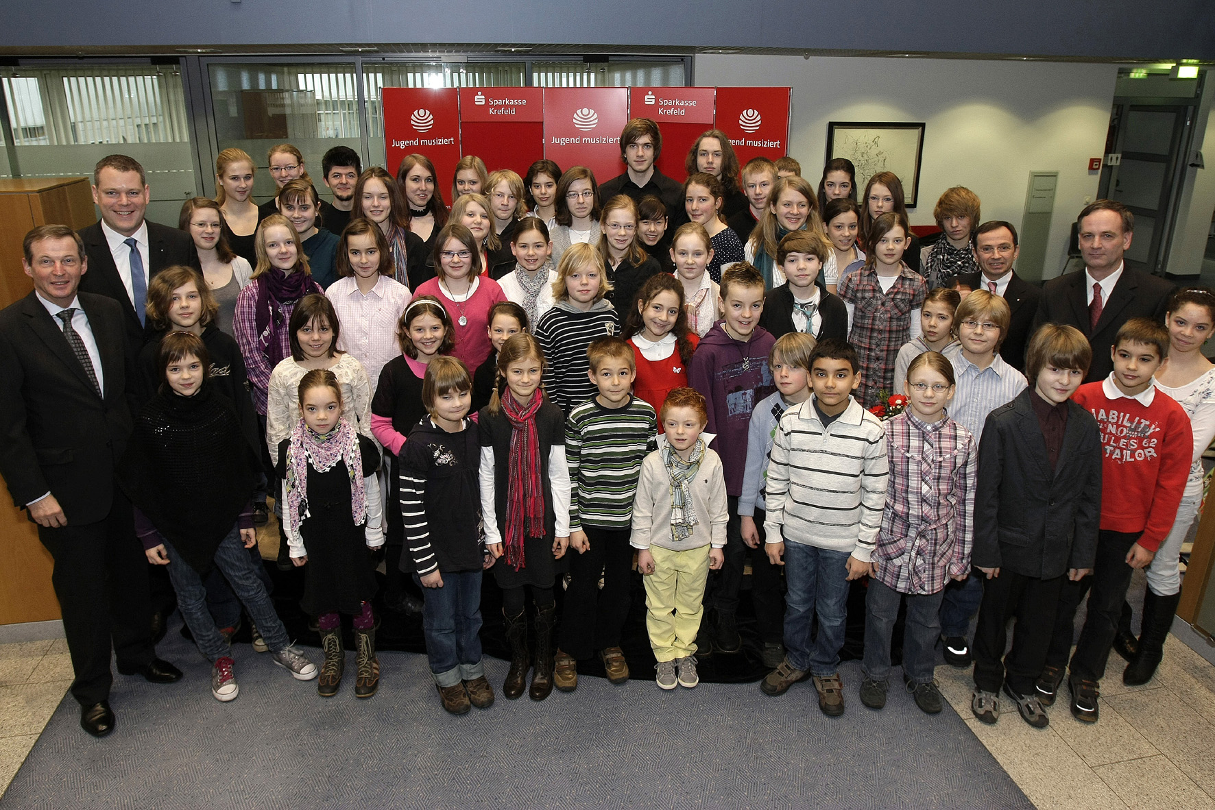 Landrat Peter Ottmann, Kreisdirektor und Kulturdezernent Dr. Andreas Coenen (von links) sowie Ralf Holtschneider, Leiter der Kreismusikschule Viersen und Regionallausschussvorsitzender des Wettbewerbs "Jugend musiziert" (rechts) gratulierten den Preisträgern. Foto: Alois Müller/Kreis Viersen - Abdruck honorarfrei