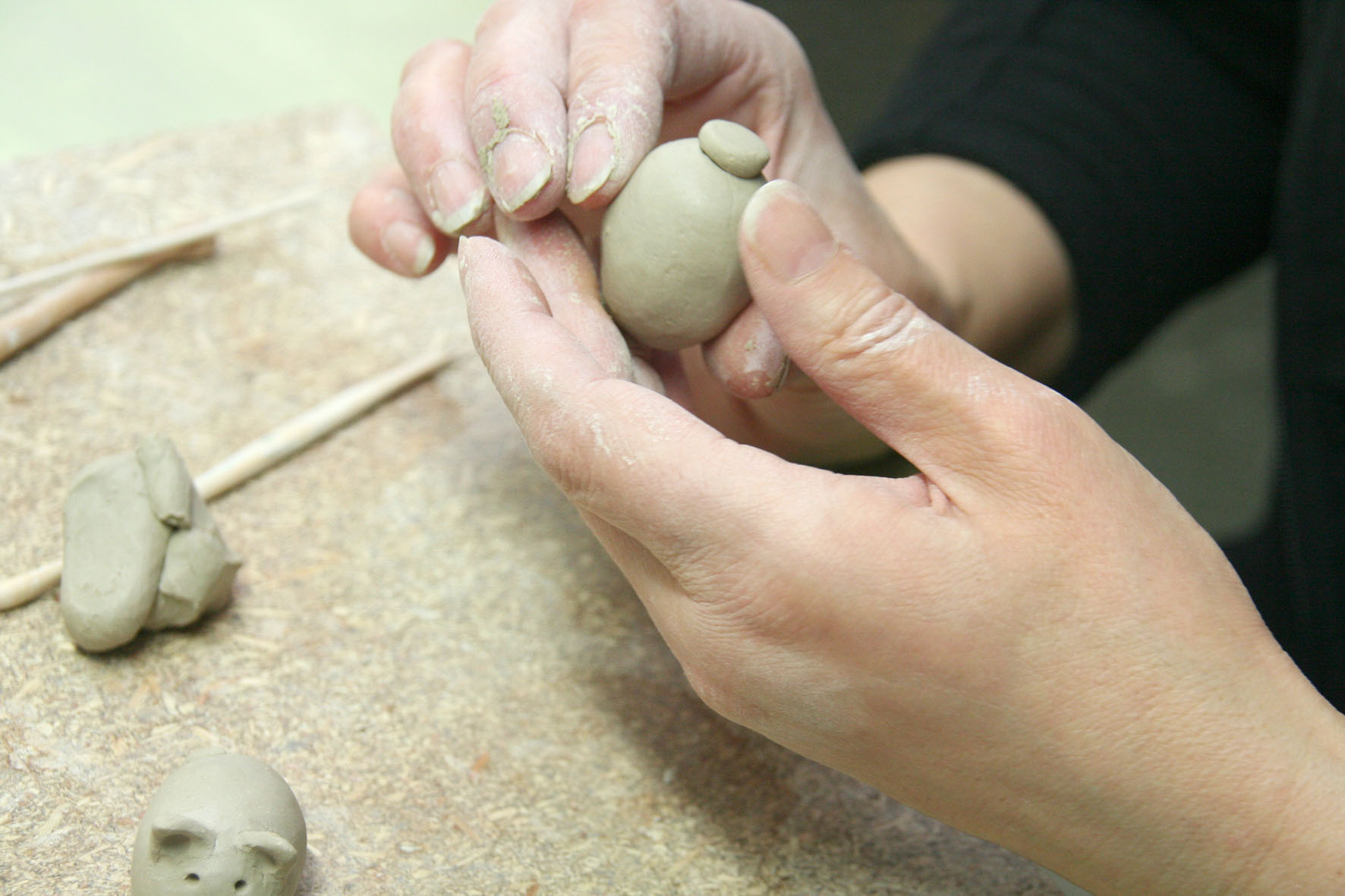 Flink formen die Hände das nasse Material. Drücken, ziehen und gestalten es, bis ein erkennbares Objekt entsteht.