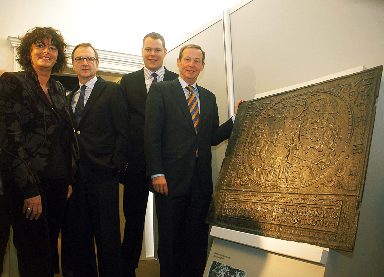Gut besucht war die Ausstellungseröffnung "Kalte Füße - heiße Platten" in der Dorenburg. Die Eisenplatten mit den religiösen Darstellungen fanden nicht nur bei Landrat Peter Otmann, Kreisdirektor und Kulturdezernent Dr. Andreas Coenen, Hans-Jürgen Kerkhoff, Vorsitzender des Stahlinstituts VDEh und Luise Fruhen, Vorsitzende des Kulturausschusses (von rechts), großes Interesse. Foto: Horst Siemes/Kreis Viersen - Abdruck honorarfrei