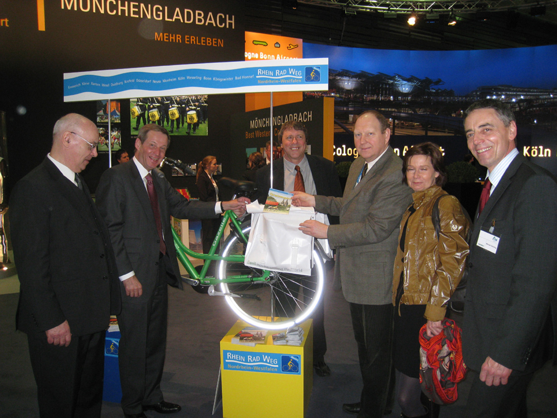 WFG-Geschäftsführer Rolf Adolphs und Landrat Peter Ottmann präsentieren MdB Uwe Schummer, Klaus Brähmig, Vorsitzender des Tourismus-Ausschusses, Dr. Ute Dallmeier, NRW Tourismus, und Michael Düchting, EntwicklungsAgentur Wirtschaft des Kreises Wesel (von links), das neue NiederrheinRad. Foto: Kreis Viersen - Abdruck honorarfrei