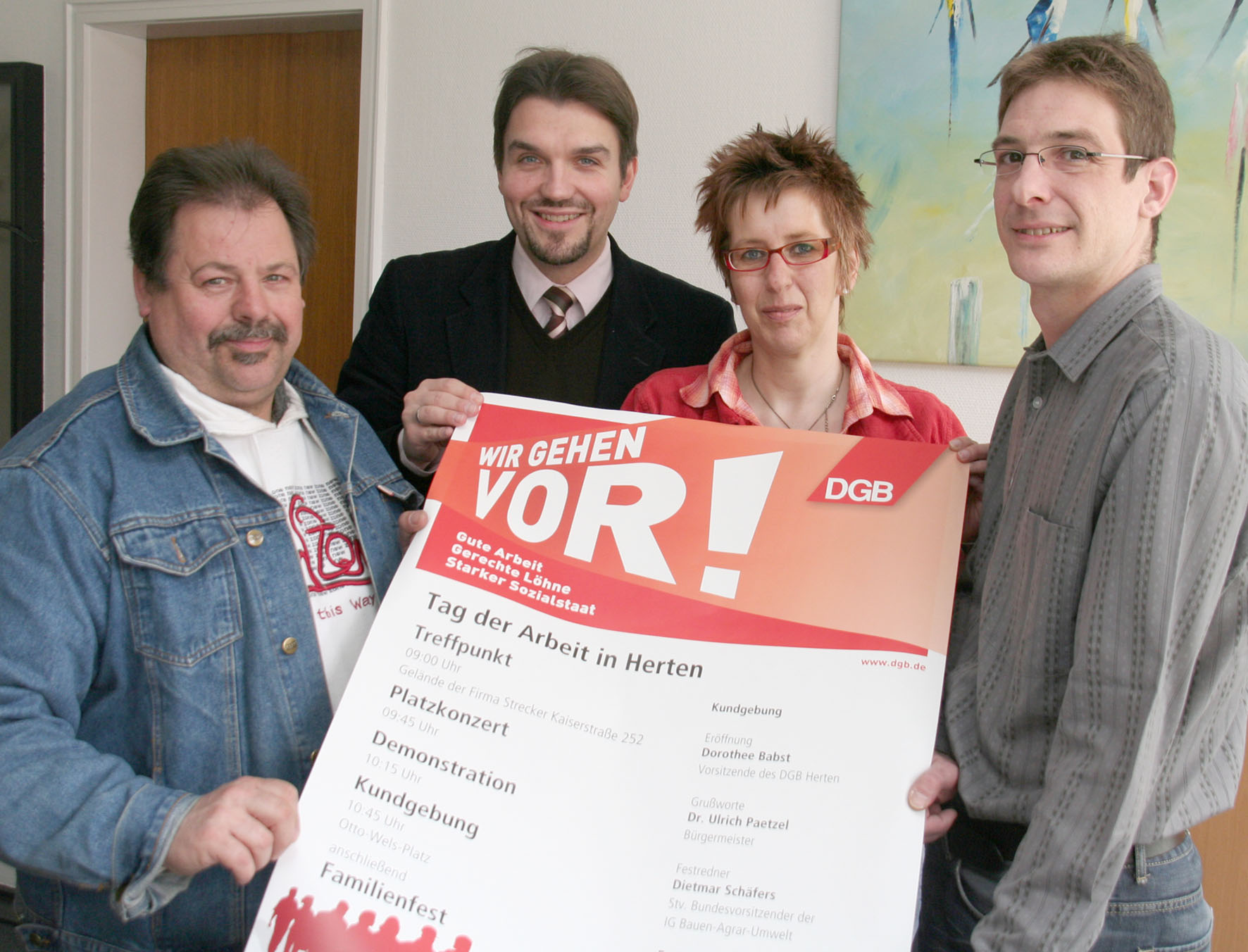 Sie gehen vor: Werner Zeis (IG BCE), Bürgermeister Dr. Uli Paetzel, Dorothee Babst und Hans Hampel vom DGB präsentieren das Plakat zur Maikundgebung.