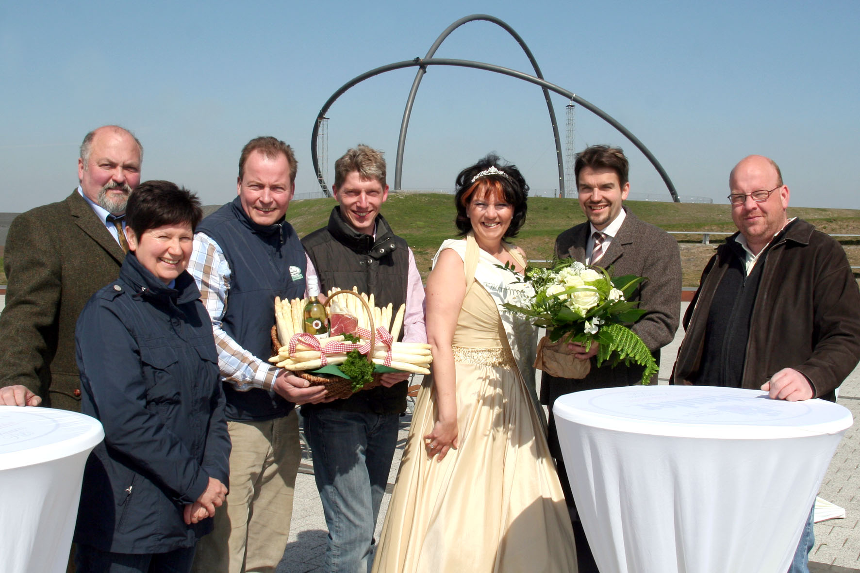 Taufrischen Spargel präsentierte Spargelkönigin Jennifer I. hier mit Bürgermeister Dr. Uli Paetzel zum offiziellen Start der diesjährigen Saison. Willi Heine, Ingrid Franzen, Heiner Schulte Scherlebeck, Frank Südfeld und Peter Große-Streuer (v.l.) freuen sich auf viele Besucher im Spargeldorf.