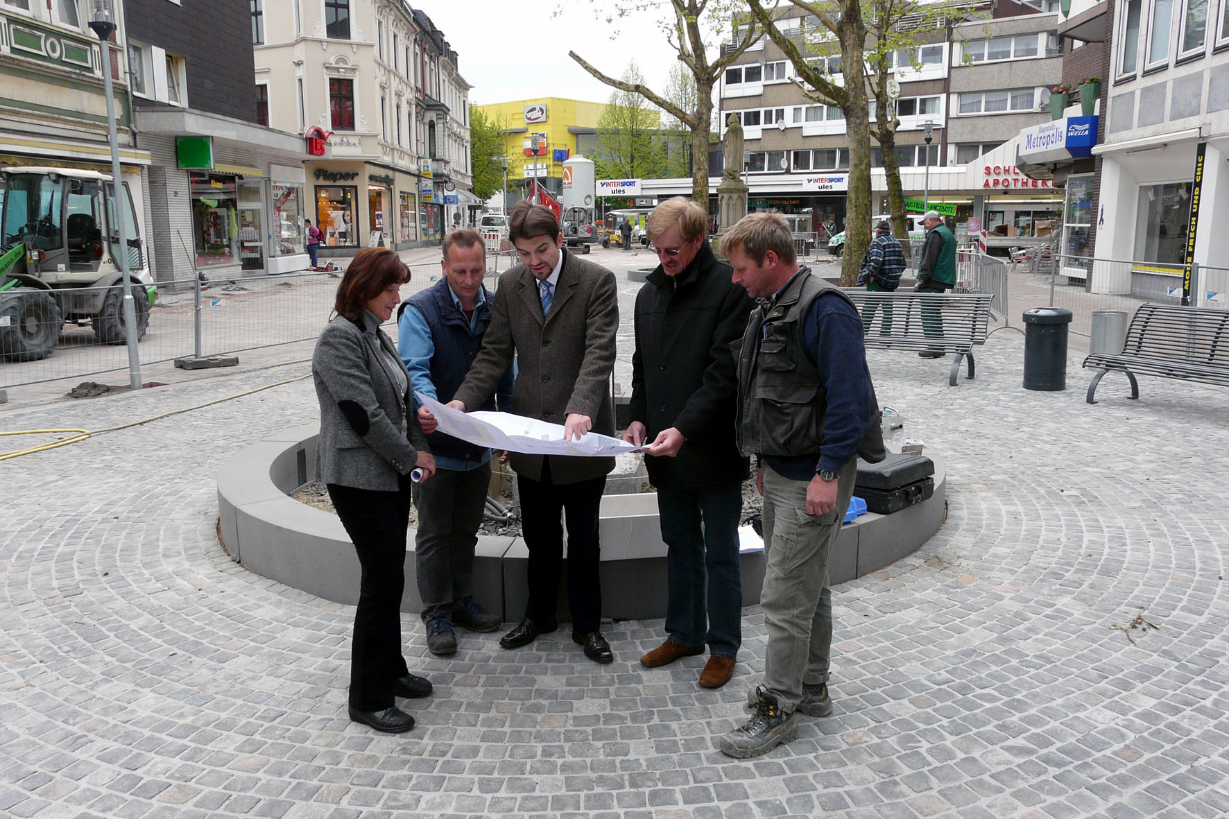 Carola Heitkemper (Tiefbau), Werner Rudel (Werbegemeinschaft), Rudolf Montino (Tiefbau), Bürgermeister Dr. Uli Paetzel und Maik Zoglauer (Firma Boymann) begutachten den Baufortschritt.
