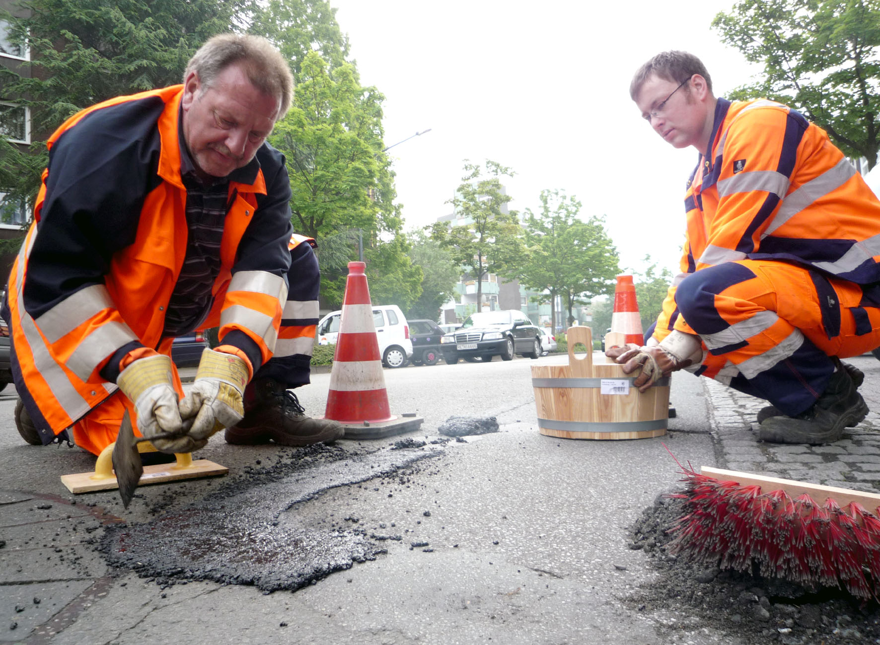 Dietmar Golombeck und Simon Rittmeier (Mitarbeiter ZBH) streichen den heißen Gussasphalt glatt.