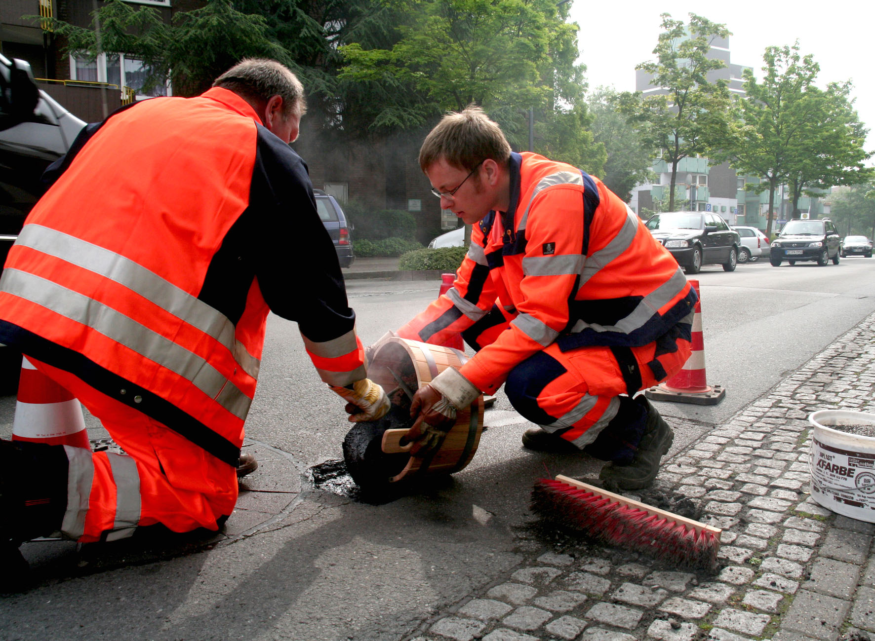 Aus dem Holzbottich verfüllen Dietmar Golombeck und Simon Rittmeier den flüssigen Asphalt. Der wurde auf 180 Grad erhitzt und würde einen Kunststoffeimer zum Schmelzen bringen.