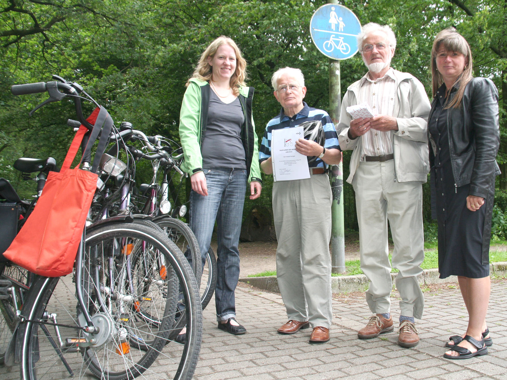 Irja Hönekopp (li.) und Lydia Schäfers (re.) vom Projektteam fahrradfreundliche Stadt Herten, überreichten Roland Kemper (mitte li.) und Horst Vogt Urkunde und Geschenke.