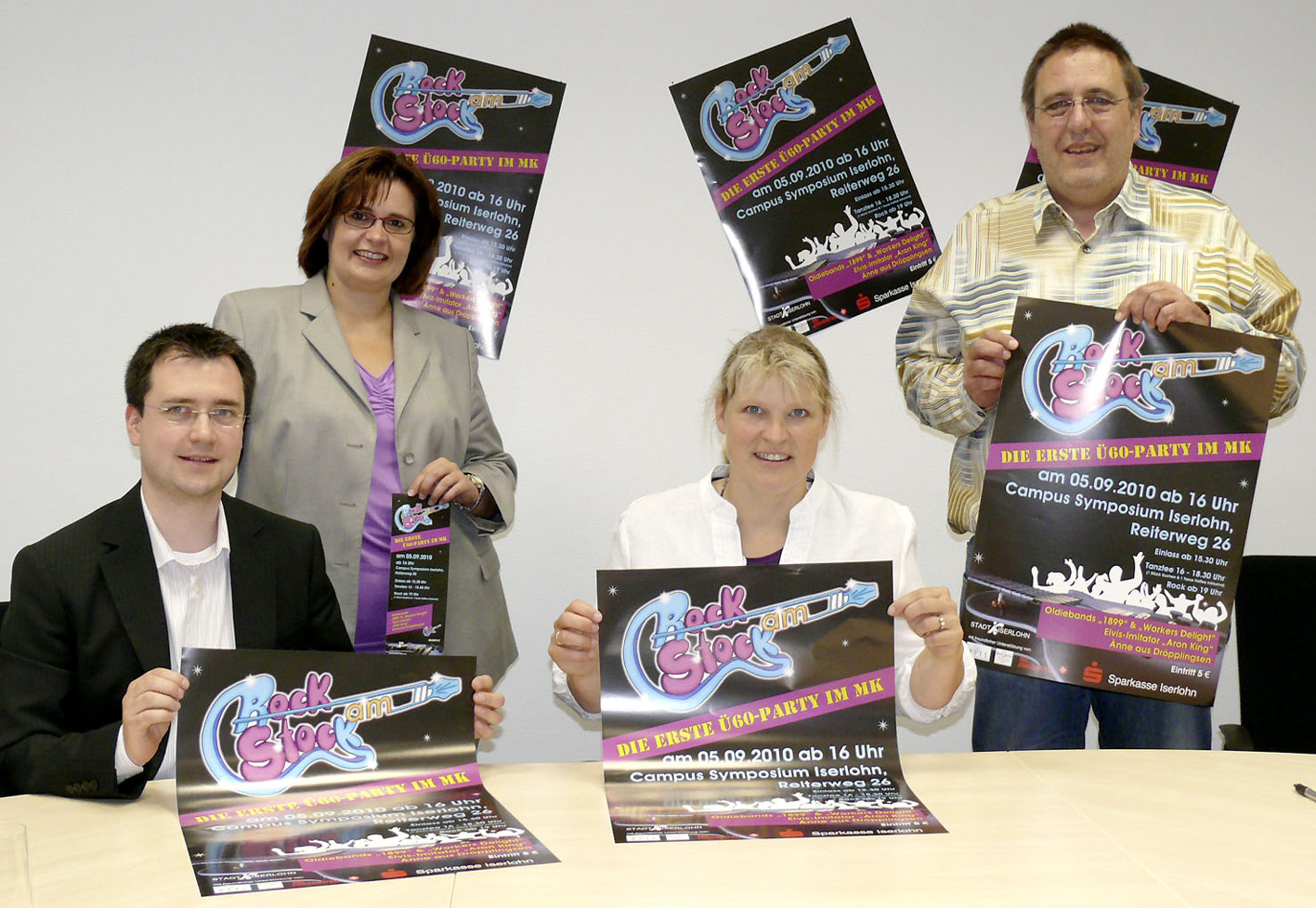 Stellten “Rock am Stock” - die erste Ü 60-Party im Märkischen Kreis vor (v.l.n.r.): Campus Symposium-Geschäftsführer Mathias Thelen, Ingeborg Woywod (Sparkasse Iserlohn), Erste Beigeordnete Katrin Brenner und Helmut Paul vom Ressortreferat Generationen und Bildung.