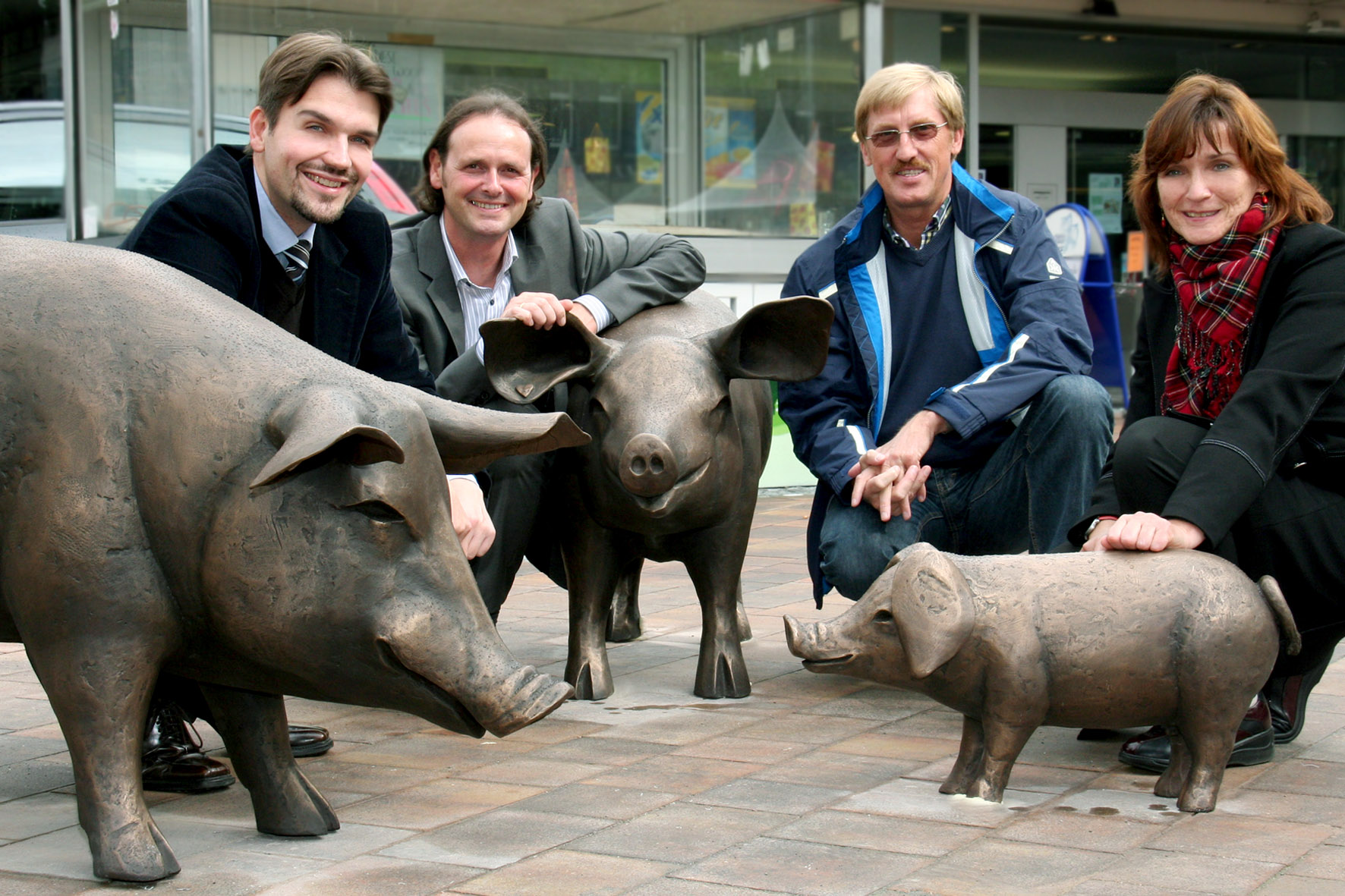 Bürgermeister Dr. Uli Paetzel, Fachbereichsleiter für Stadtentwicklung und Wirtschaftsförderung, Ralf Teerporten, Diplom-Ingenieur Rudolf Montino vom städtischen Tiefbau und Carola Heitkemper, Leiterin städtischer Tiefbau begutachten die bronzenen Schweine auf der Kranzplatte. (v.l.)