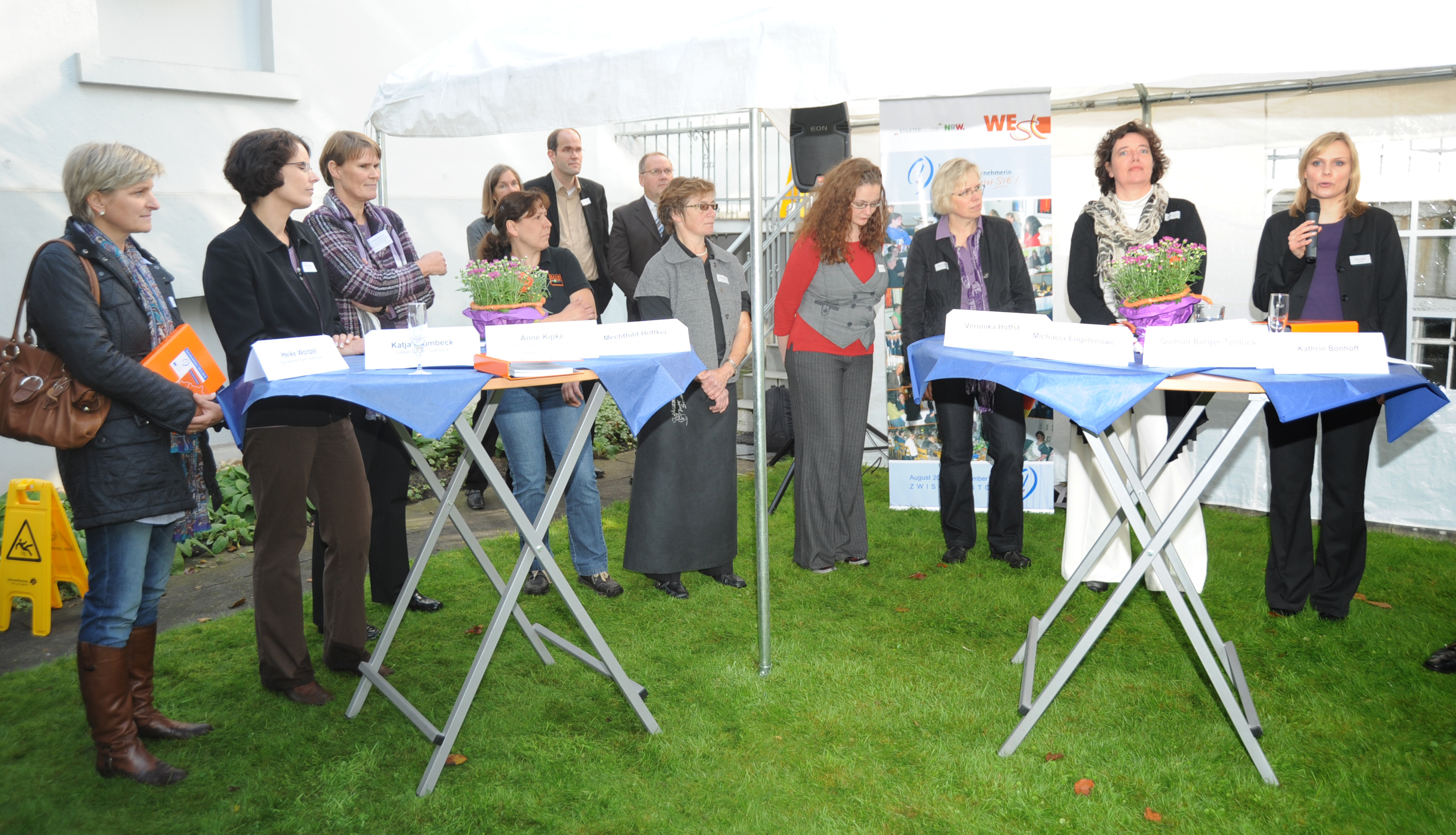 Vorgestellt haben sich (v. l.) Heike Woitzel (Sektkellerei im Schultenhof, Mettingen), Katja Krumbeck (Lütkes Laden, Saerbeck), Anne Kipke (Raumpflege Plus, Emsdetten), Mechthild Höffker (Jägerhof, Borghorst) und Veronika Hoffstädt (Pro Musica, Westerkappeln). Außerdem auf dem Foto (3.v.l.): Helga Reckenfelderbäumer, Projektkoordinatorin bei der WESt.