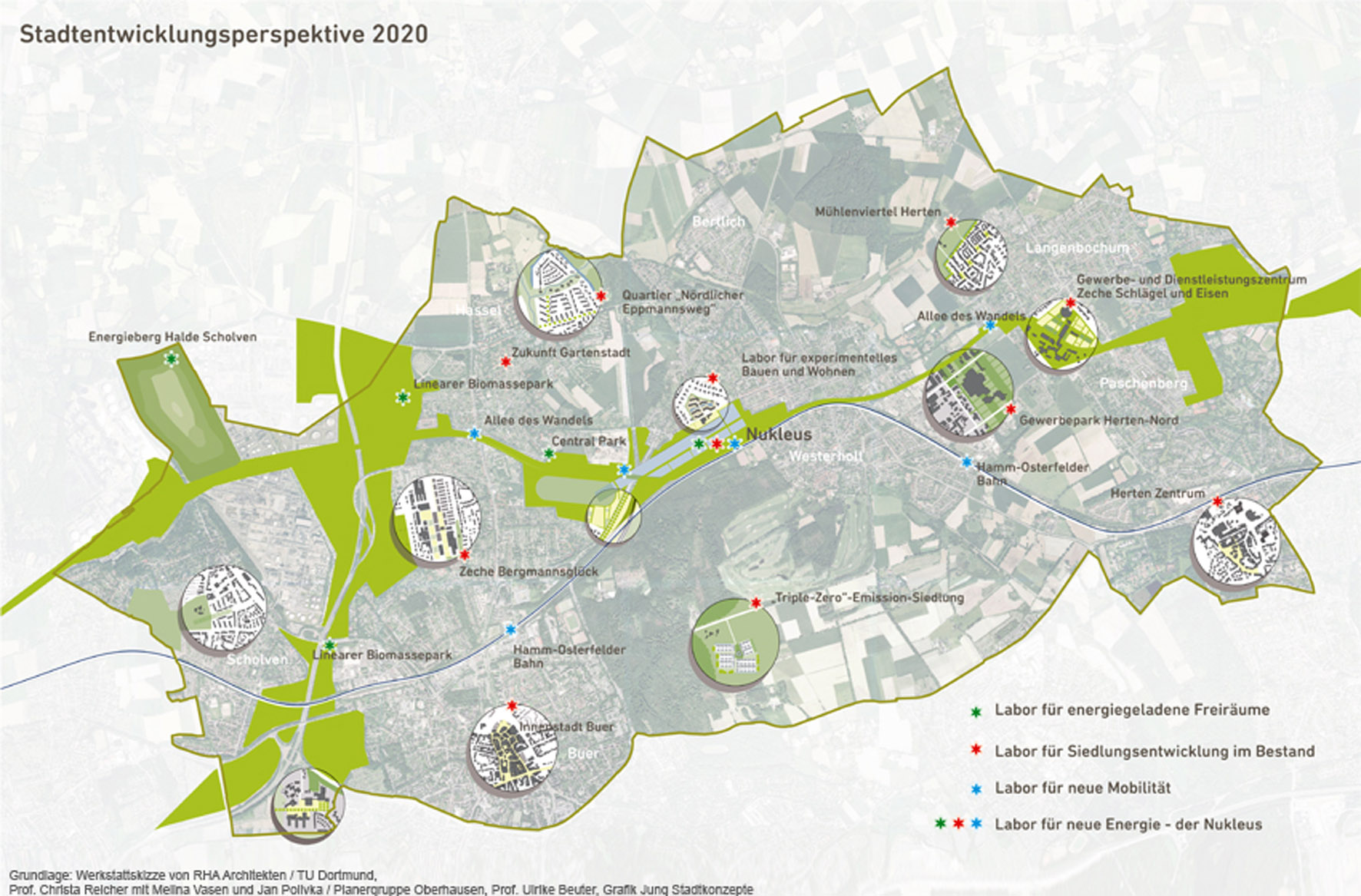 InnovationCity - Stadtentwicklungsperspektive 2020 Grundlage: Werkstattskizze von RHA Architekten / TU Dortmund, Prof. Christa Reicher mit Melina Vasen und Jan Pollvka / Planergruppe Oberhausen, Prof. Ulrike Beuter, Grafik Jung Stadtkonzepte.