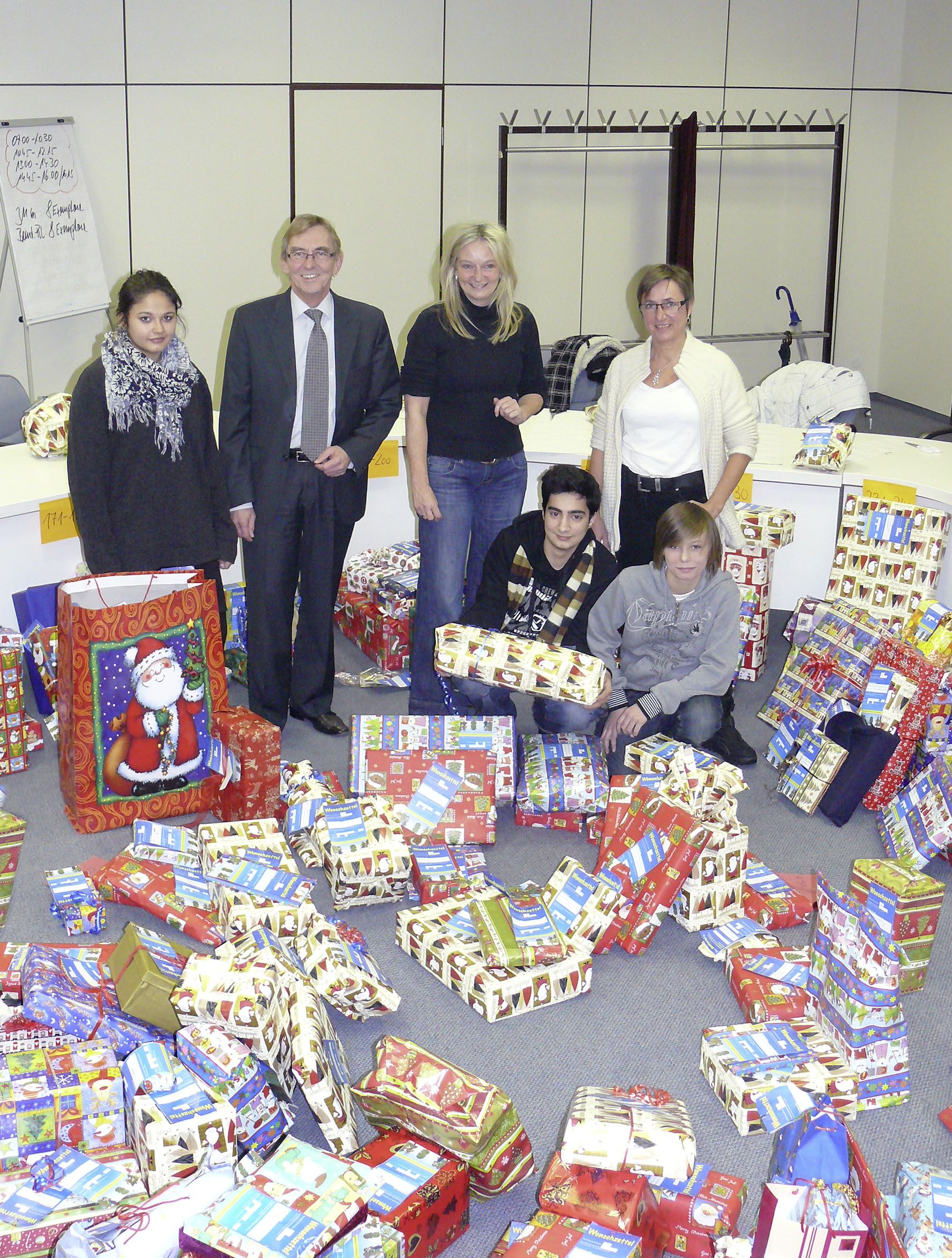Bürgermeister Dr. Peter Paul Ahrens, das Team des Kinder-und Jugendbüros und drei kleine Helfer freuen sich über den Erfolg der Wunschbaum-Aktion.