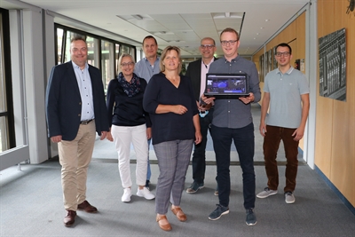 | Sie stellten das neue Klimaportal vor: Landrat Bodo Klimpel (l.), Peter Haumann (3. v. r.), Fachbereichsleiter Umwelt, Verkehr, Geoinformation, Planung und Wirtschaft, Anke Kunz-Rohlf (2. v. l.), Jutta Emming (m.) und Torben Stasch (r.), das Klima-Team des Kreises Recklinghausen, sowie Martin Eckl (2. v. r.) und Marc Schäper (3. v. l.), zuständig für die Regioportale des Kreises.